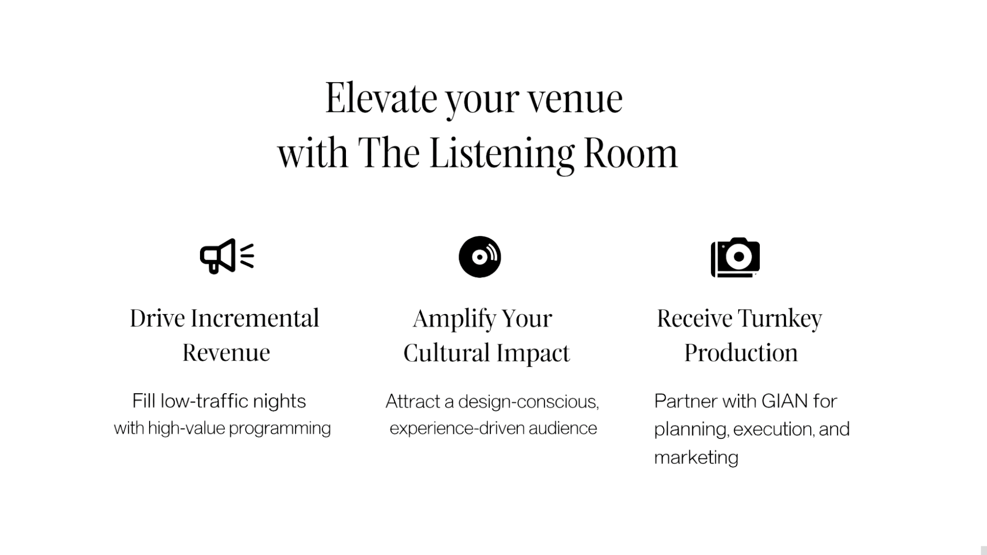 Full production of the Listening Room experience, including spatial design, ambiance, and guest flow